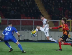 Pemain sayap AC Milan Christian Pulisic (tengah) menyontek bola untuk mencetak gol keduanya ke gawang Lecce dalam lanjutan Liga Italia di Stadion