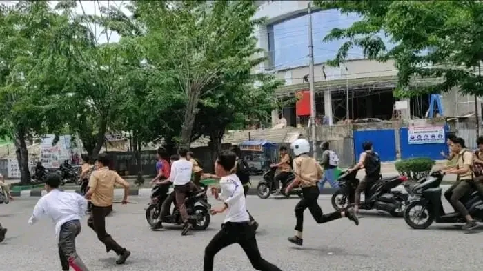 Puluhan pelajar kocar kacir usai diserang warga di Jalan Sisingamangaraja Medan tepatnya di seberang Jalan Air Bersih, Medan, Jumat (8/8/2025).