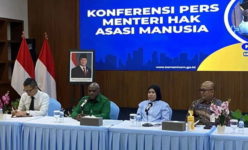 Menteri HAM Natalius Pigai (dua kiri) saat konferensi pers di Kantor Kementerian HAM, Jakarta, Kamis (3/7/2025)
