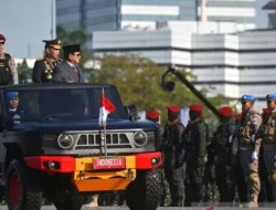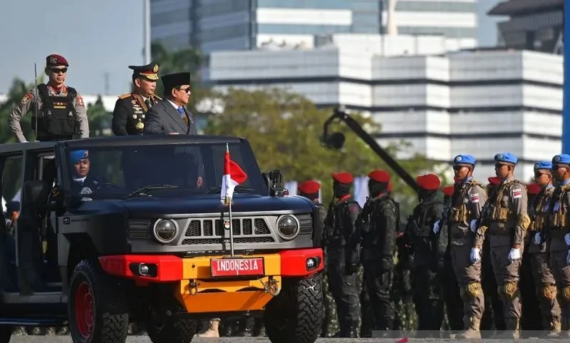 Jakarta – Presiden Prabowo Subianto selaku inspektur upacara memimpin upacara peringatan HUT Ke-79 Bhayangkara di Lapangan Silang Monumen Nasional (Monas), Jakarta, Selasa.