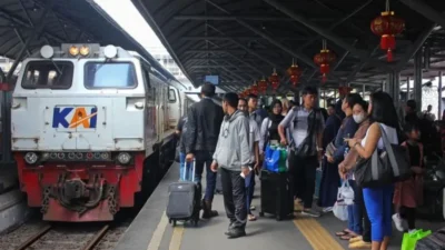 Ilustrasi – Penumpang menunggu kedatangan kereta api di Stasiun Surabaya Gubeng, Surabaya, Jawa Timur. …