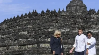 Presiden Prabowo Subianto (kanan) bersama Presiden Prancis Emmanuel Macron (tengah) dan istri Brigitte Macron (kiri)…
