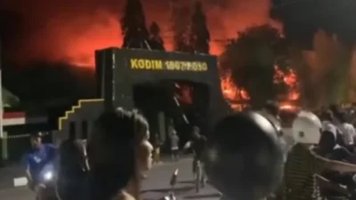 Kebakaran melanda Markas Komando Distrik Militer (Kodim) 1307/Poso, Sulawesi Tengah, Senin (26/5/2025) malam. Nusantara…